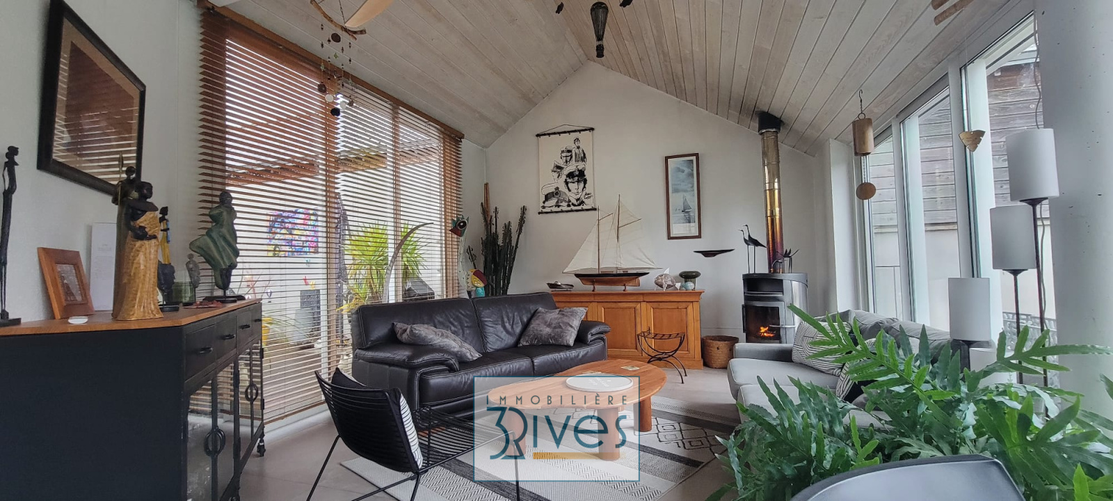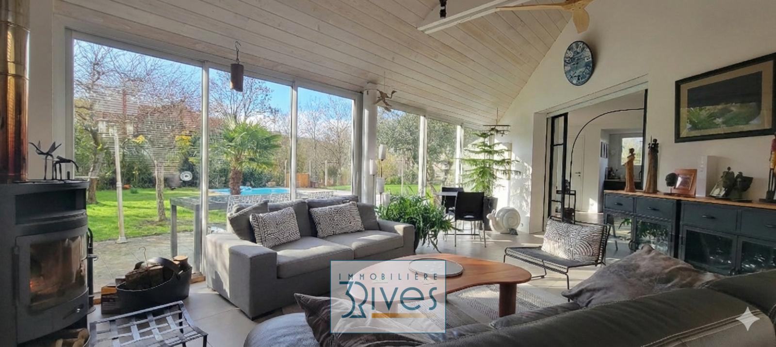 Pour vos moments de détente, un second salon plus intimiste vous attend avec son poêle à bois. Un agencement flexible et adapté à vos projets d’été ou d’hiver.