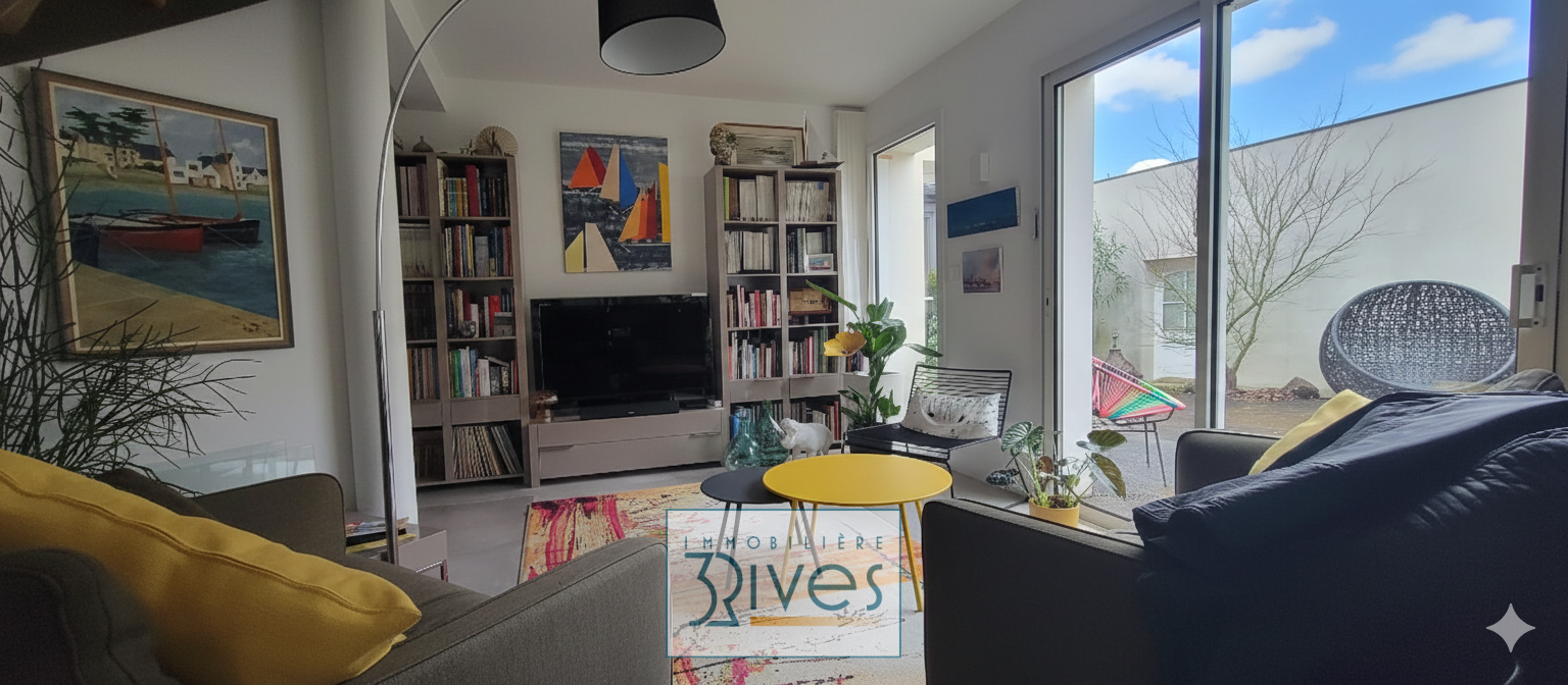 Dès l'arrivée, le ton est donné par une entrée en patio qui assure calme et intimité. La maison s'ouvre ensuite sur une pièce maîtresse : une pièce de vie lumineuse de 55 m² avec cuisine, largement ouverte sur l'espace piscine pour une sensation "dedans-dehors" permanente.